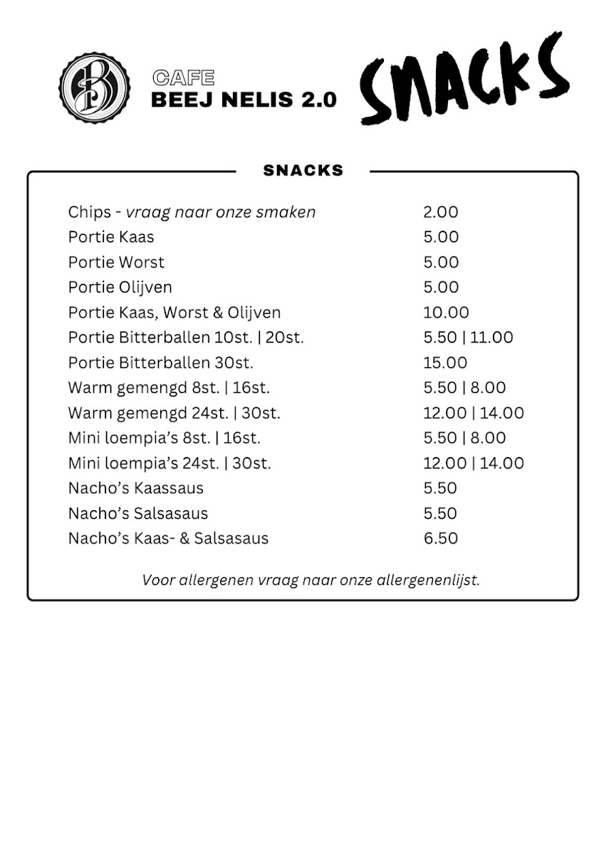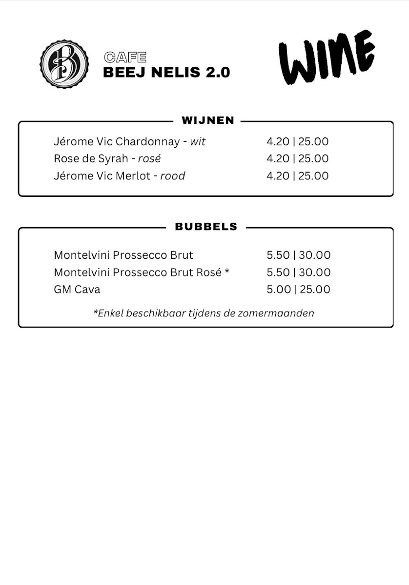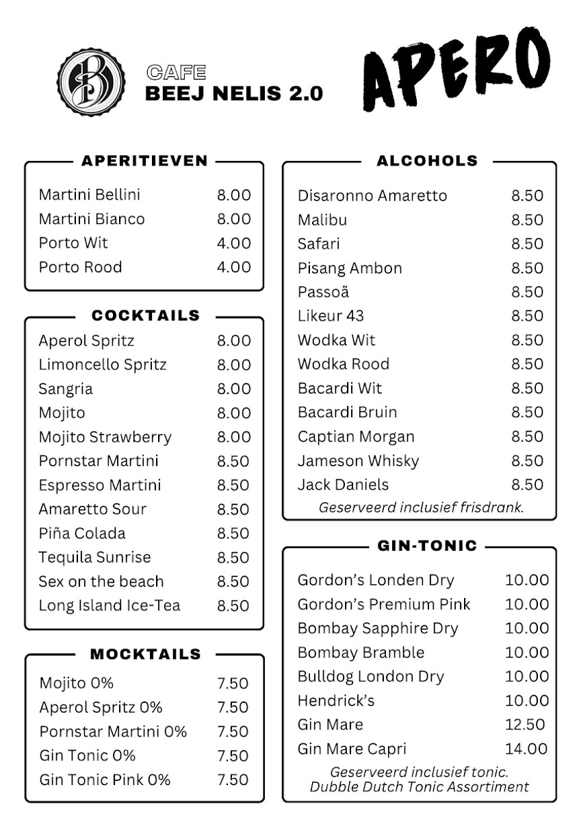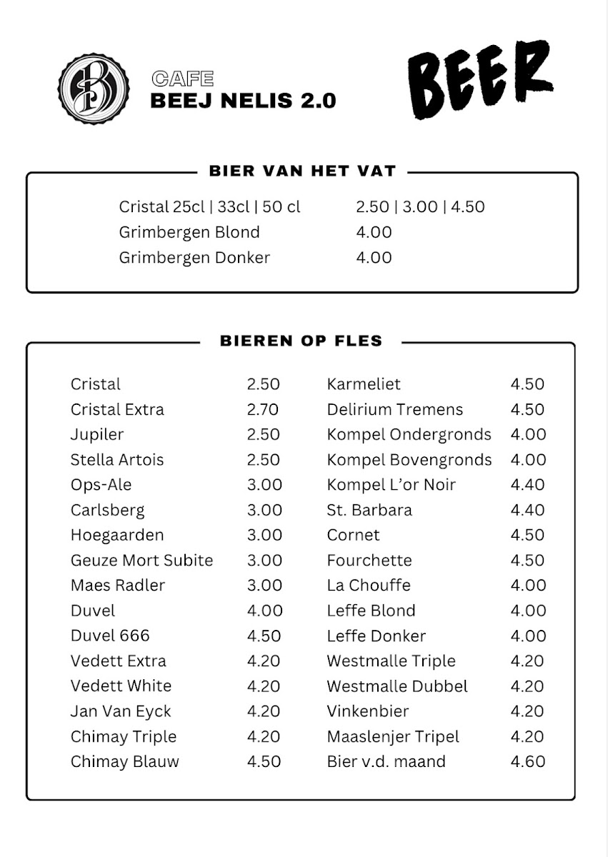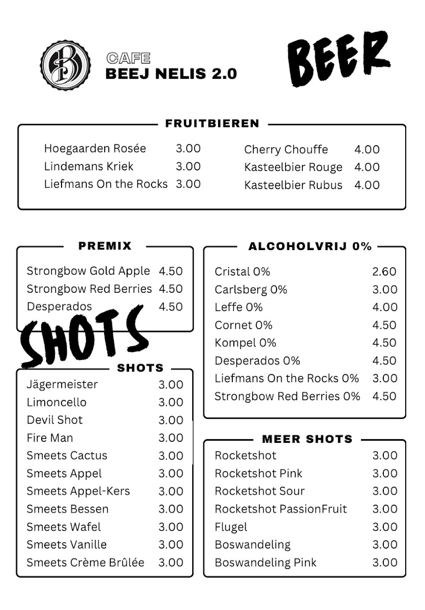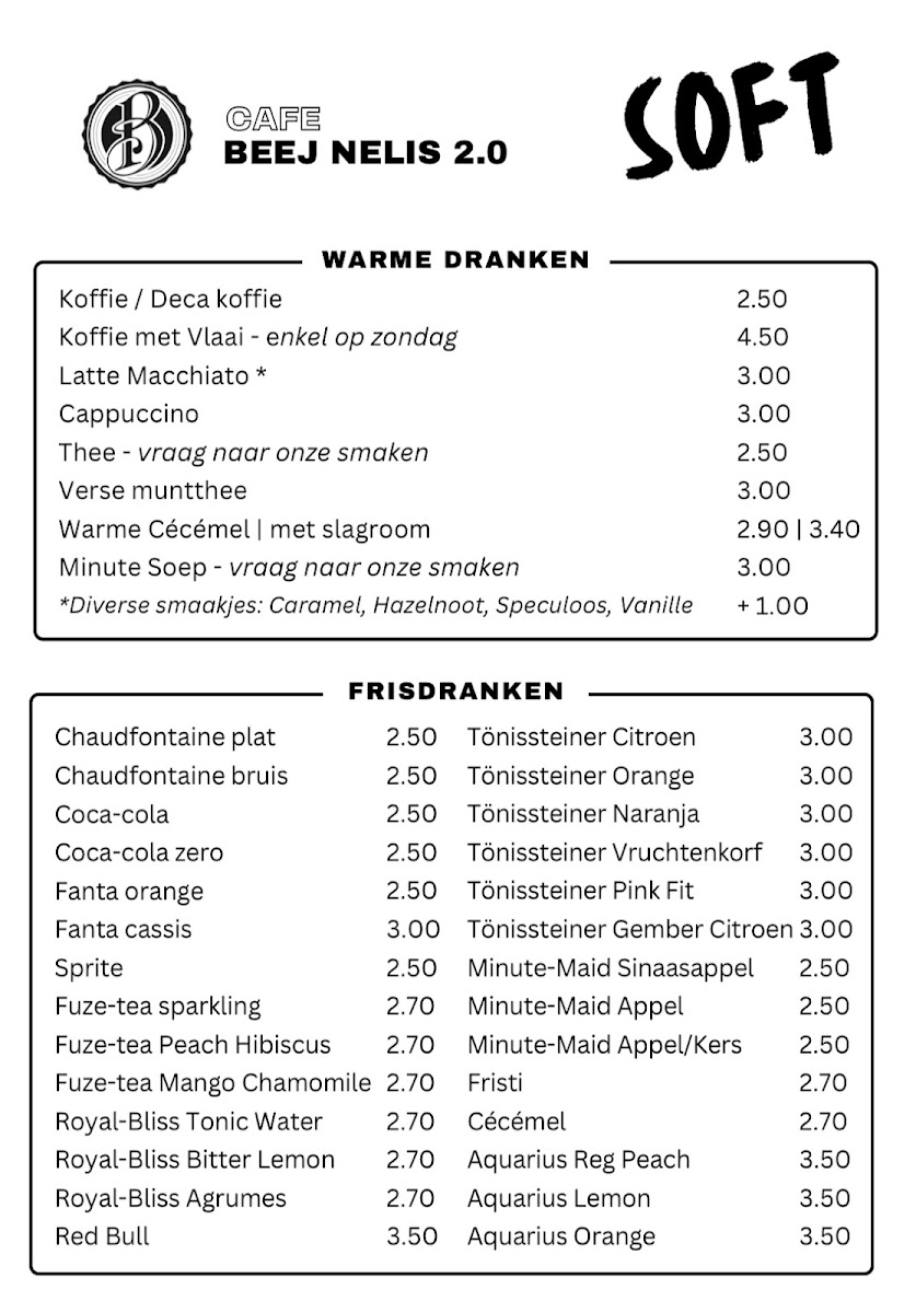 The menu offers a variety of options typical for a café setting, including a selection of coffees, beers, and light food items suitable for casual dining or quick orders. Visitors can expect brewed coffee and espresso-based drinks alongside a range of beers, highlighted by choices such as Levertraantje, Jupiler, Levens Elixer, Sterkedrank, and Champion. Light bites and snacks are available to complement beverages, making the menu appropriate for breakfast, coffee breaks, or light meals throughout the day.